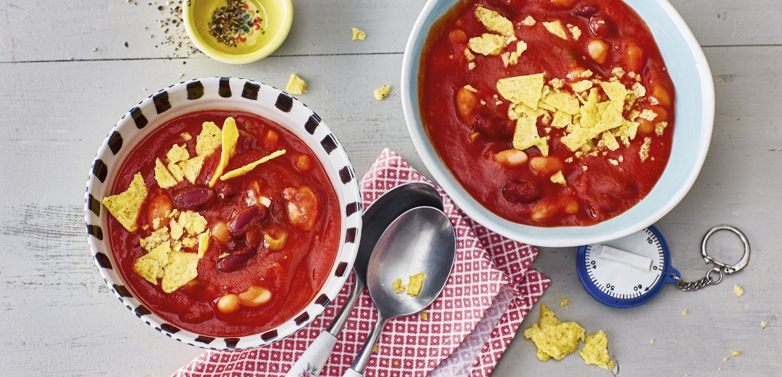 - Die Kidneybohnen und die weißen Bohnen in ein Sieb schütten und mit kaltem Wasser gründlich abbrausen. Leicht abtropfen lassen und zur Tomatensuppe geben. Die Temperatur noch mal erhöhen, bis die Bohnen heiß sind. Die Bohnensuppe auf Teller verteilen und jeweils mit ein paar zerbröselten Tacochips bestreuen.